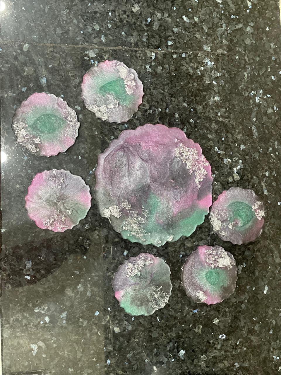 Its made up of Resin, 1 large plate with 6 small coasters. It can be customize in any color. It can be used in home decor and as in Crockery.